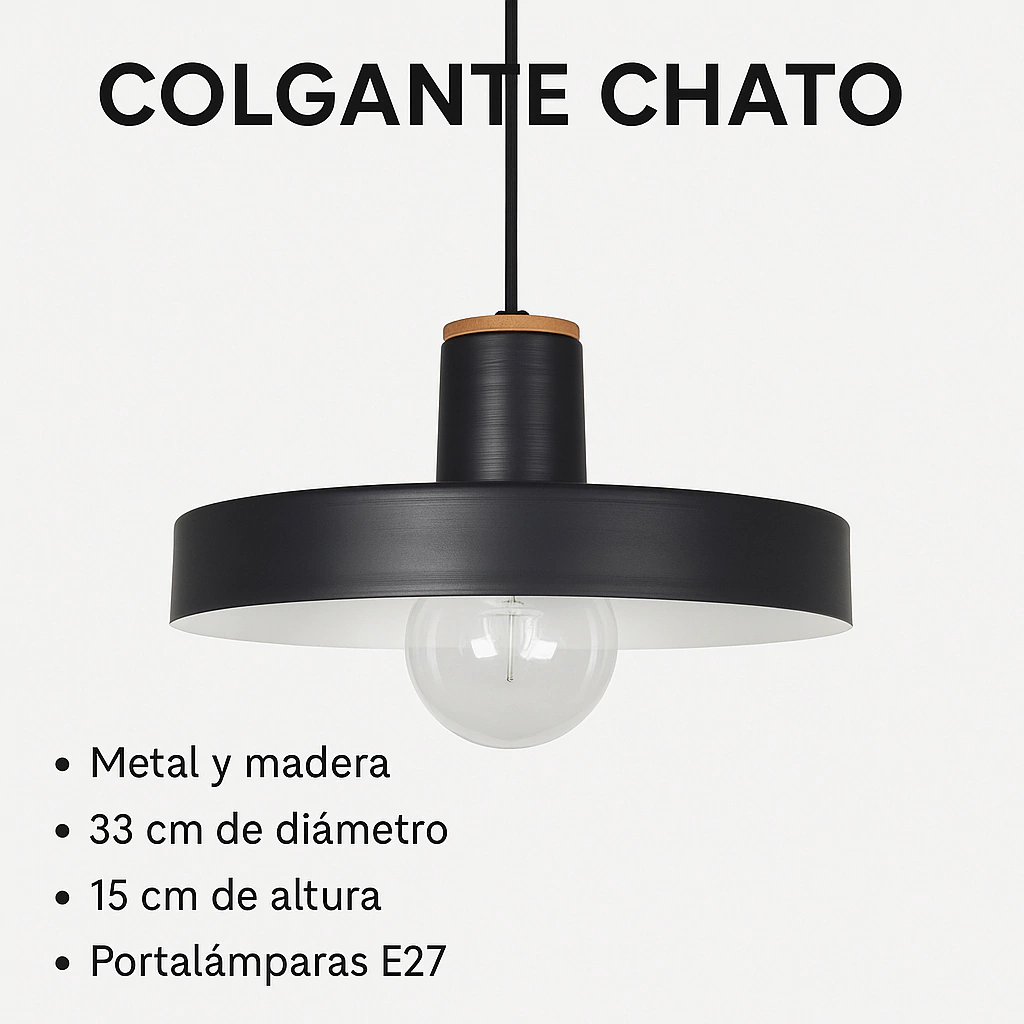 El modelo Chato combina metal negro mate con un toque de madera natural, logrando un diseño equilibrado entre lo rústico y lo moderno. Perfecto para iluminar espacios con estilo industrial, minimalista o nórdico.