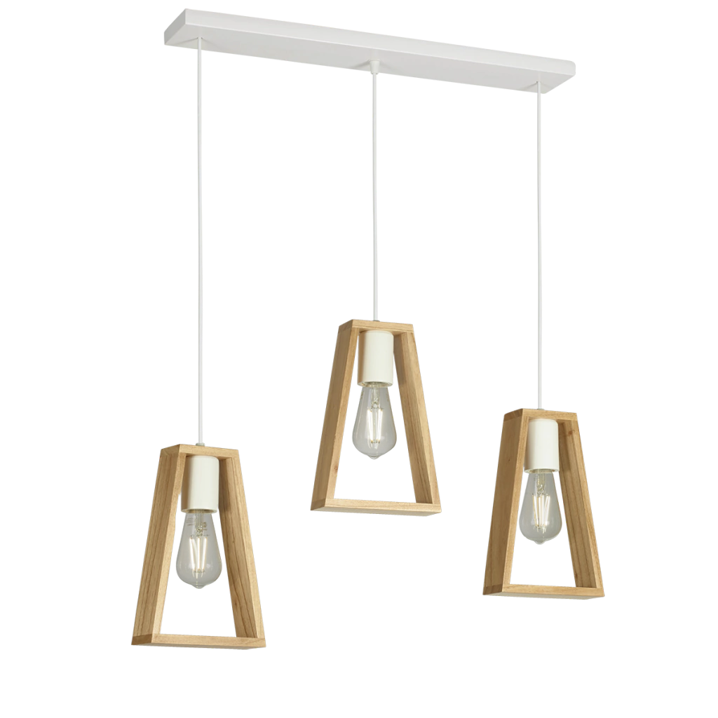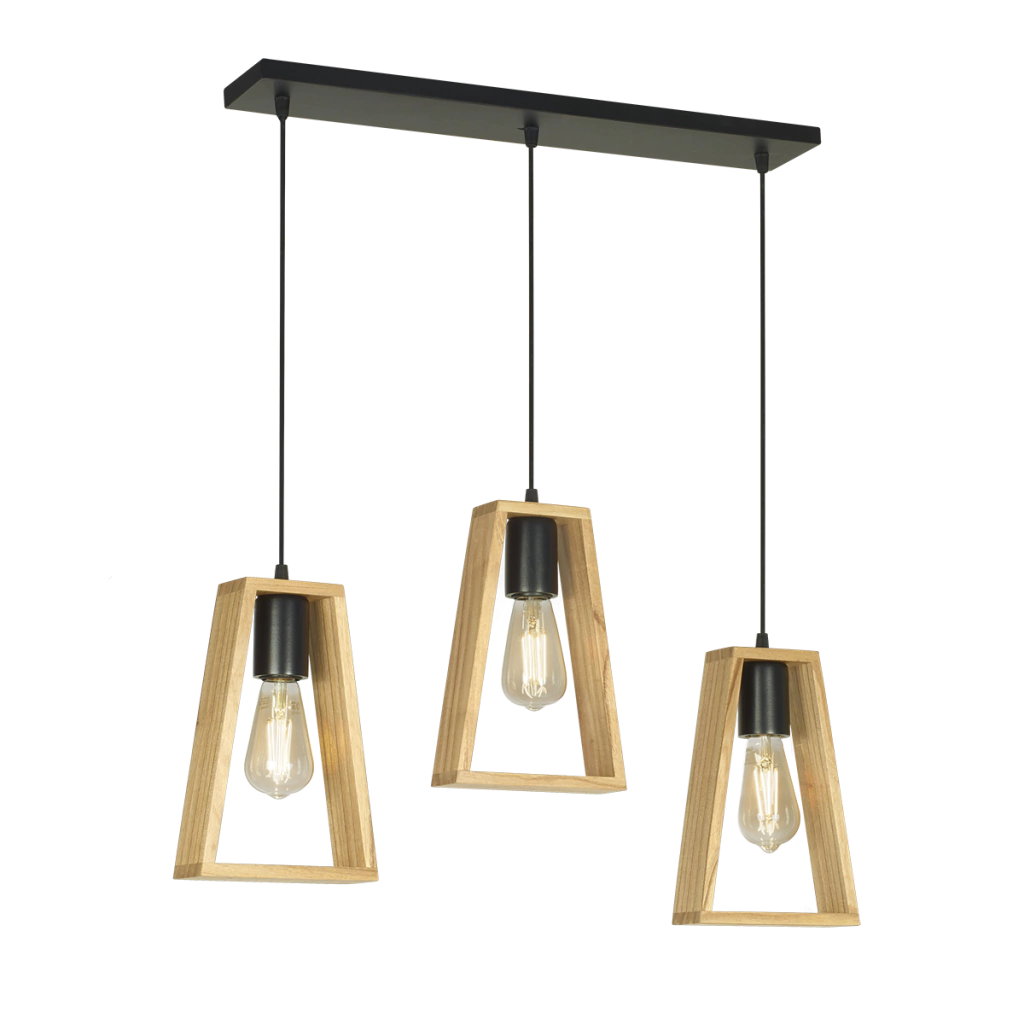 El modelo CO3 combina diseño moderno con calidez natural. Compuesto por tres marcos de madera paraíso con líneas limpias y un formato trapezoidal, montados sobre una base de 60 x 10 cm en madera pintada (negro, blanco o natural). Ideal para iluminar con estilo barras, mesas de comedor o islas.
