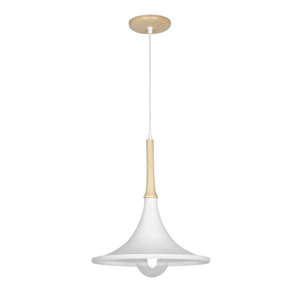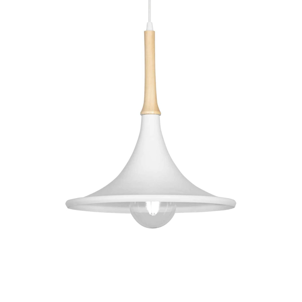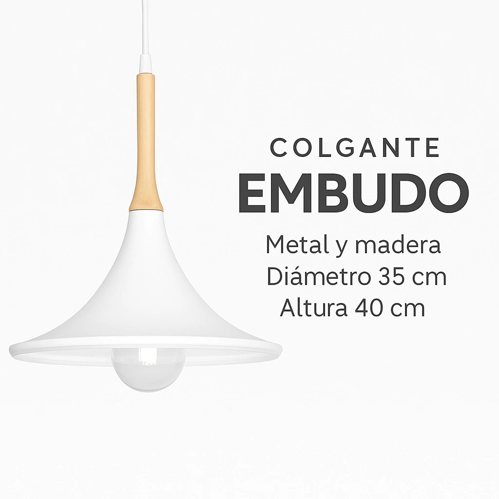 El colgante EMBUDO destaca por su forma orgánica, estilizada y original. Su cuerpo blanco en forma cónica invertida, acompañado por un remate superior de madera natural y cable textil blanco, lo convierte en una luminaria moderna, delicada y llamativa.